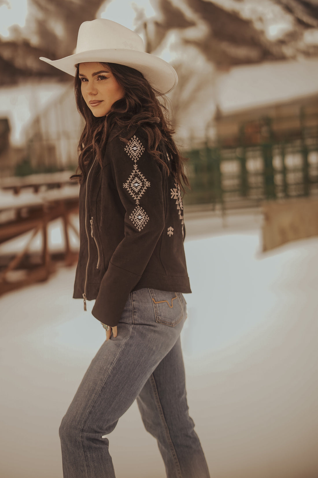 Ladies Faux Suede Jacket with Aztec Embroidery On The Back and Sleeves