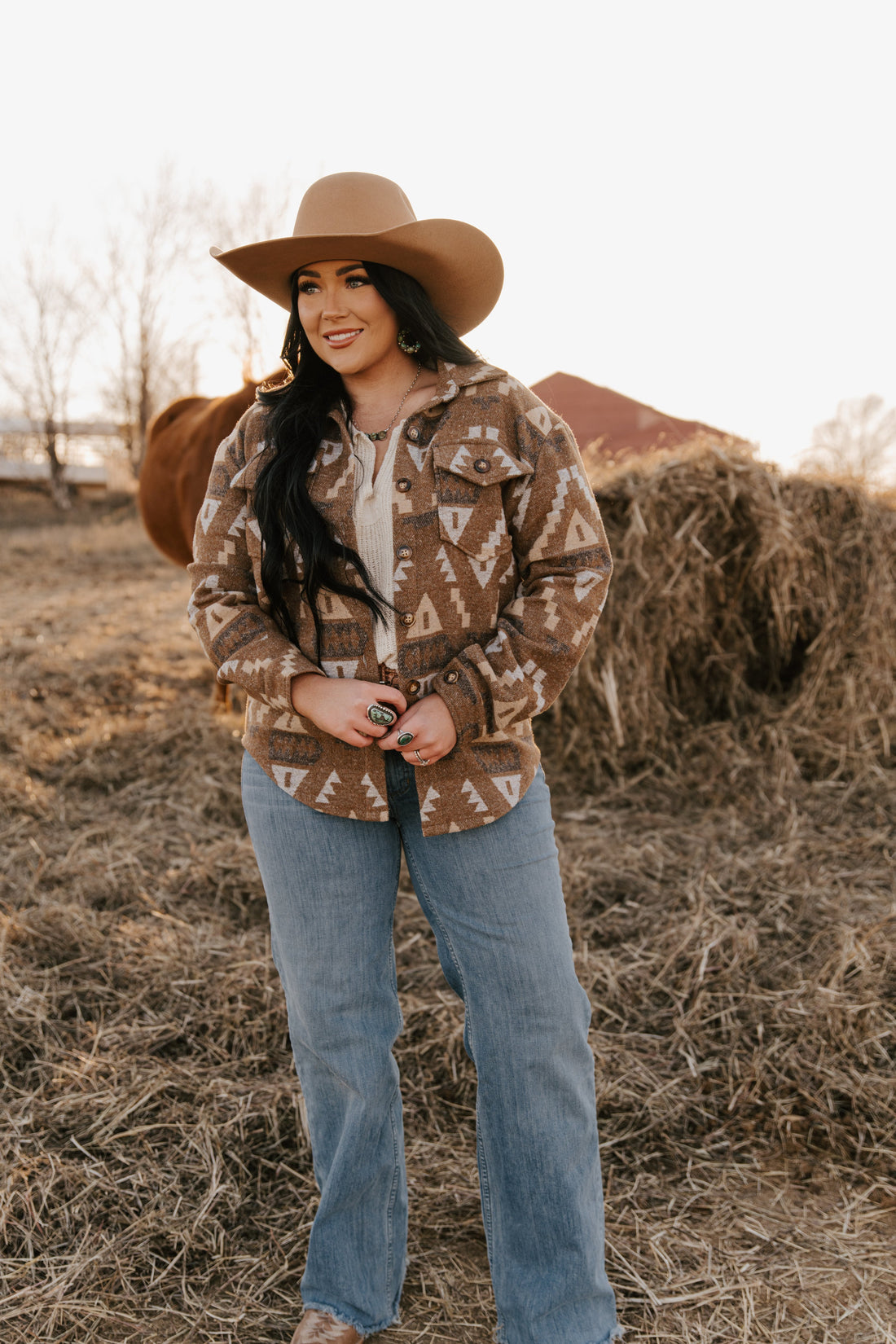 This Ladies Aztec Shirt Jacket combines distinctive Aztec-inspired patterns with the practicality of Western-style flap...