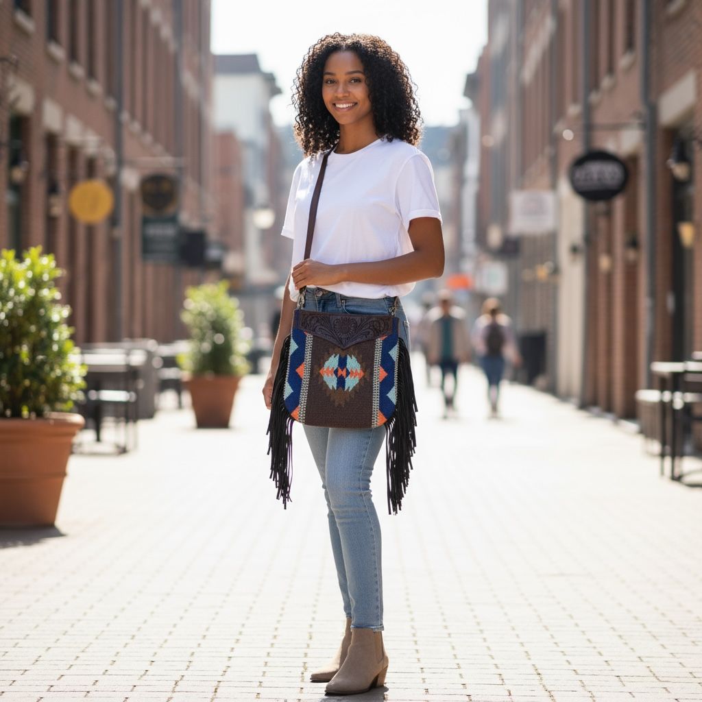 The Western Crossbody Bag with Fringes T-1304 showcases a bold Aztec pattern crafted with premium...