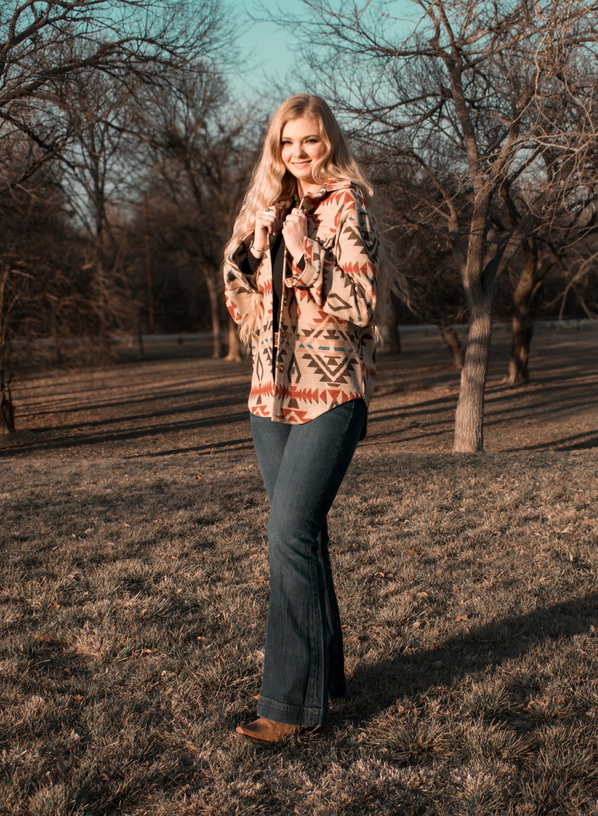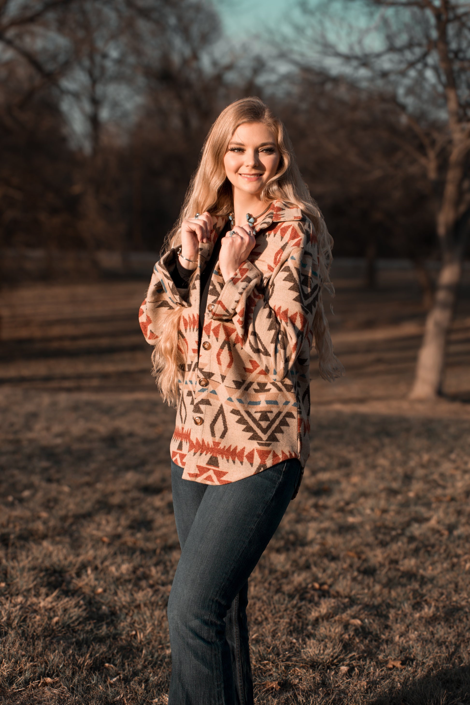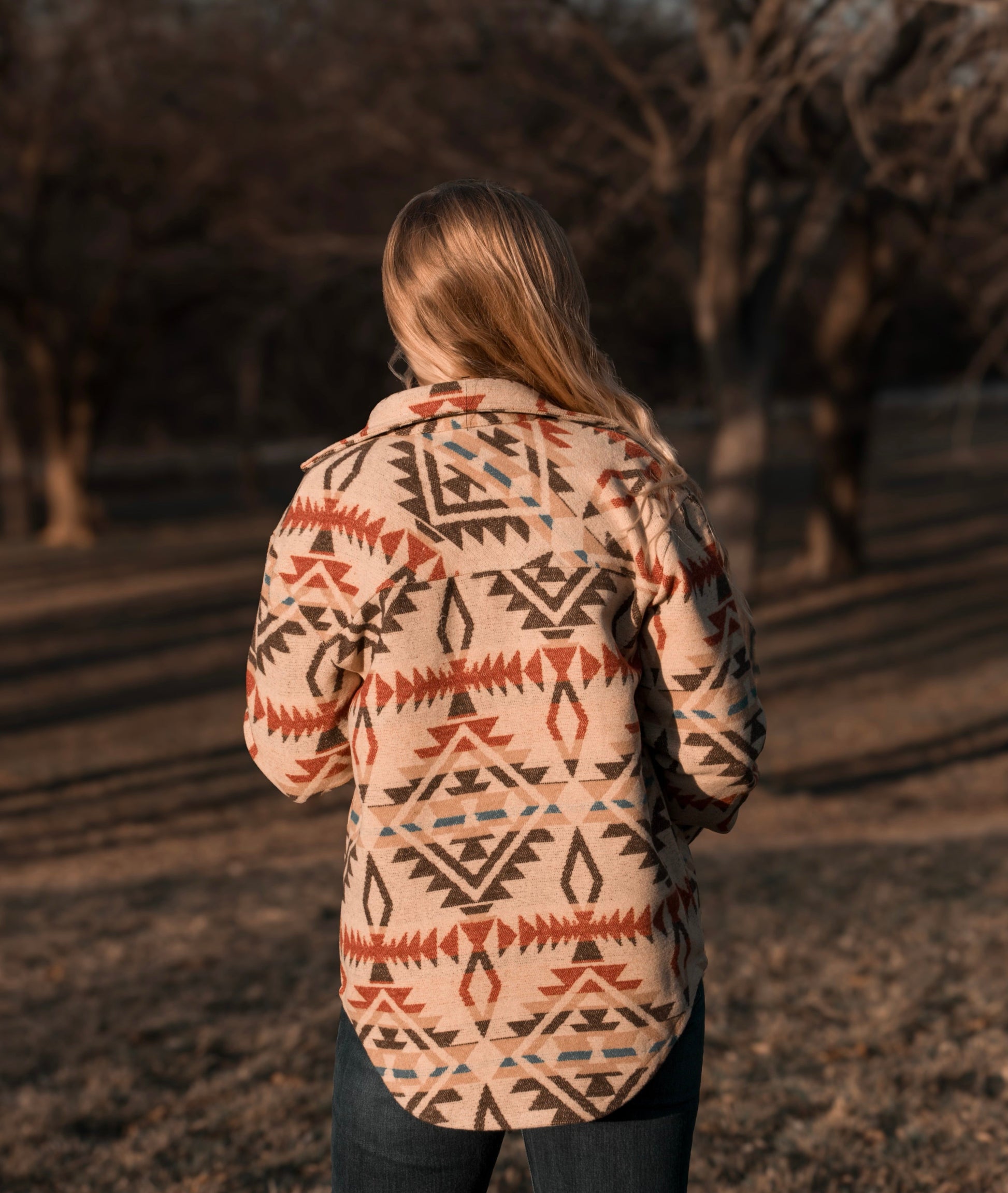 This Ladies Aztec Shirt Jacket combines distinctive Aztec-inspired patterns with the practicality of Western-style flap chest pockets. Crafted for both style and function, it offers a unique blend of cultural design and everyday wearability. Ideal for adding a bold accent to your casual wardrobe while keeping essentials close at hand.