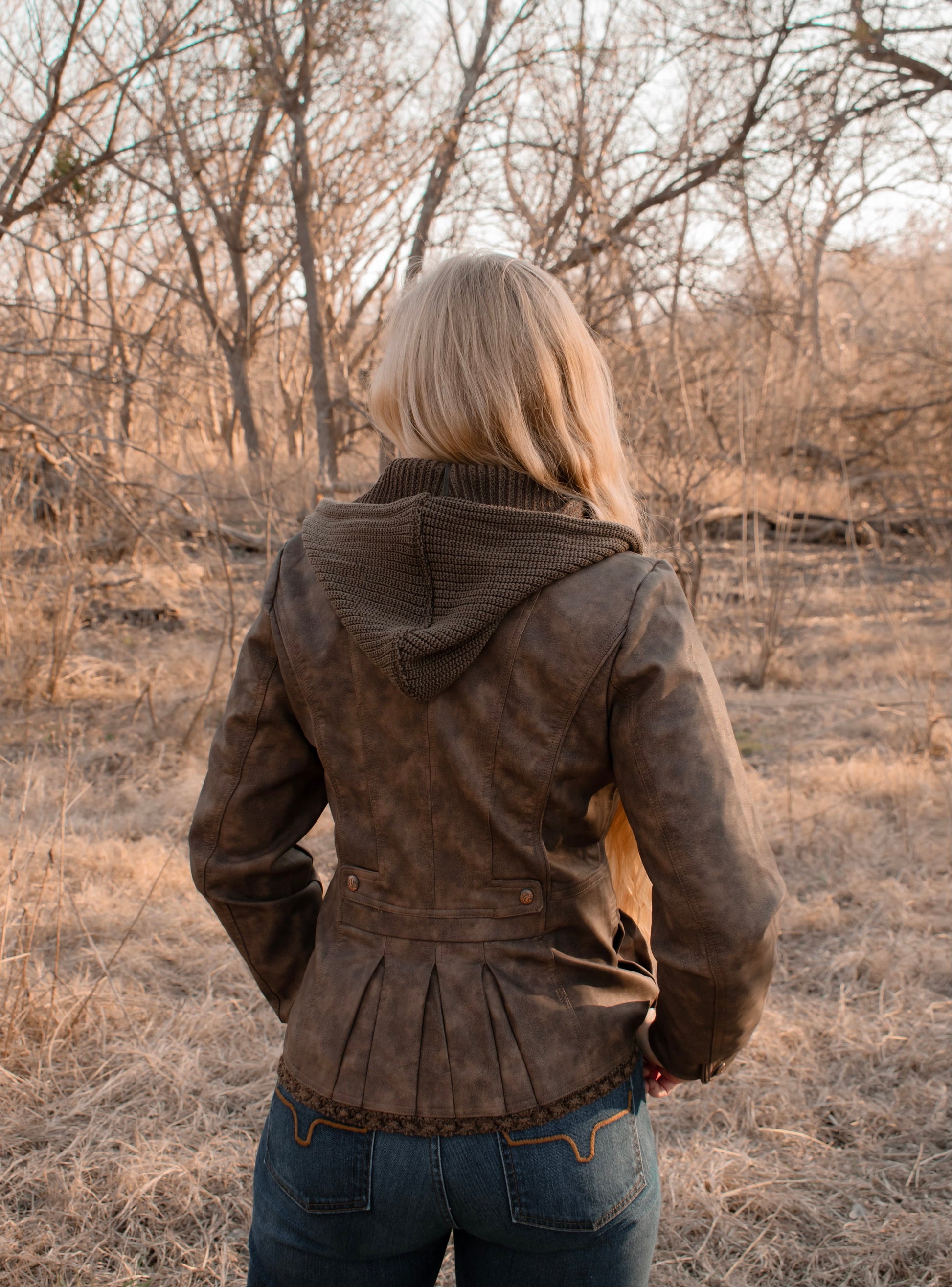 Ladies Poly Faux Leather Fahion Jacket - with Plate and Knit Trims and Hood
